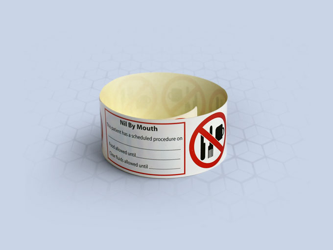 Provides nursing staff with an essential additional visual reminder that a patient should not be taking food or liquids. The wristband creates awareness for the patient themselves, doctors, nurses, auxiliary staff and visitors, that the patient should not be eating or drinking. Highly visible on the patients wrist the bracelet includes sections that can be handwritten by staff detailing the exact times that the patient has to abstain from food and/or drink.
